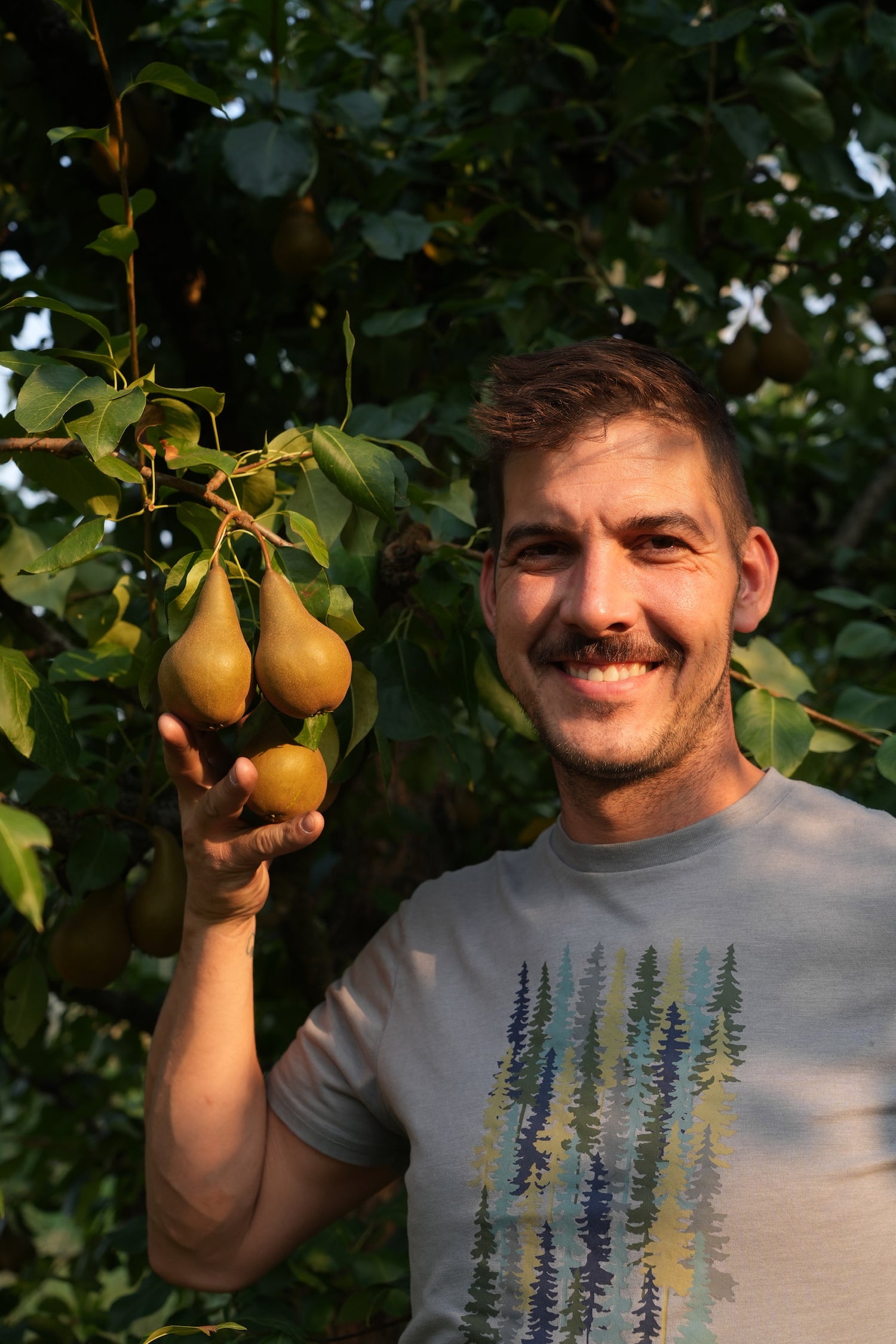 During the summer, both Dan and Steve regularly head back to the family farm in Oliver to help pick fruit and pack. Dan has his mechanic’s ticket and pilot’s license. He also has oddly double-jointed “hitchhiker’s thumbs” and can whistle louder than anyone we know! Dan loves our pears and loves selling a product he can be proud of.