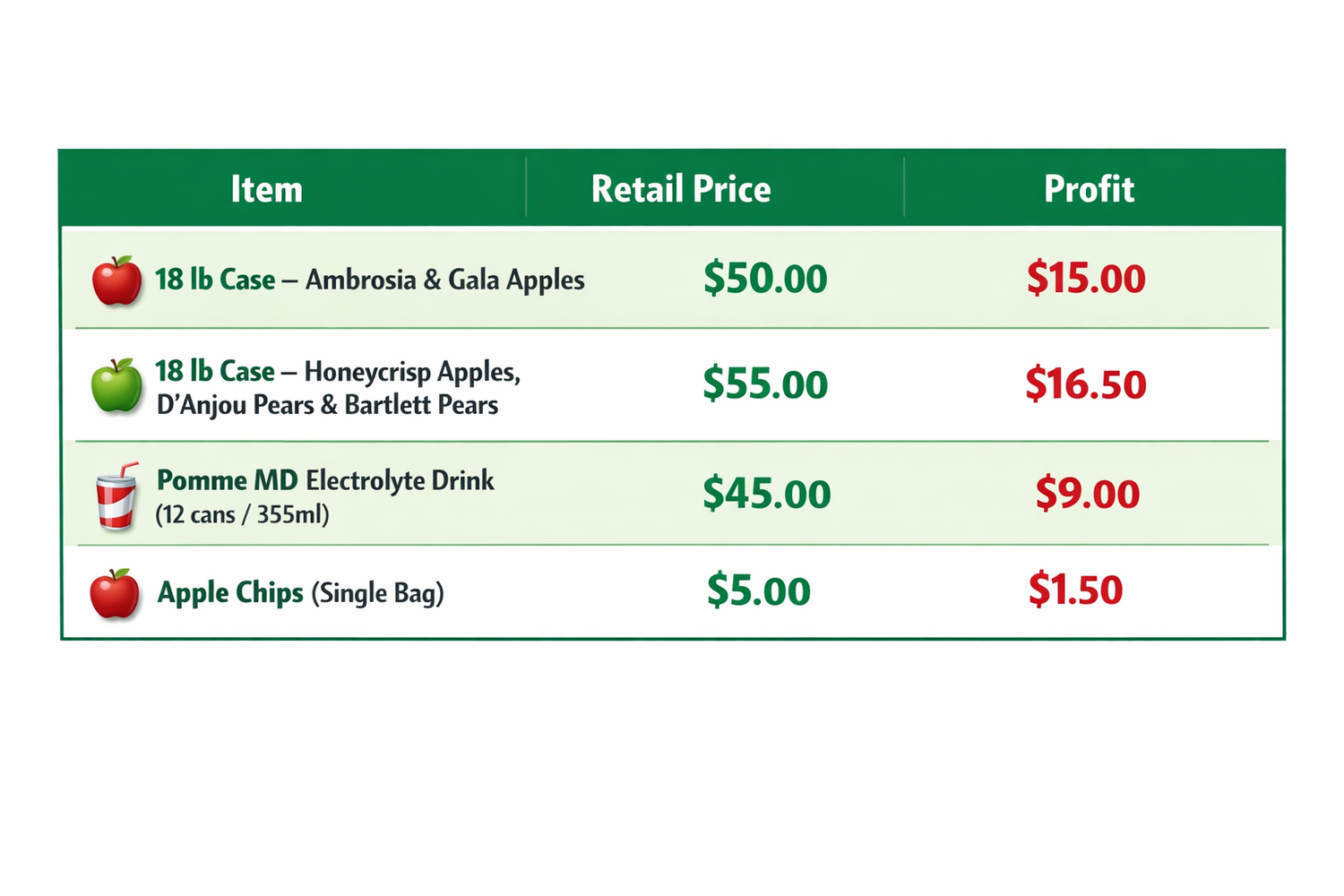 For this fundraising initiative, we will be offering three apple varieties (Ambrosia, Honey Crisp & Gala), two pear varieties (D’Anjou & Bartlett), our Apple Chips, as well as PommeMD apple electrolyte drink for your participants to sell.